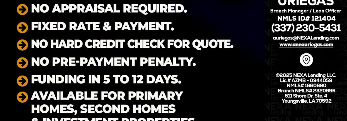 Hi, my name is Anna Uriegas. I’m a Loan Officer with NEXA Lending LLC., offering personalized mortgage solutions, fast customized quotes, great rates and service with integrity.