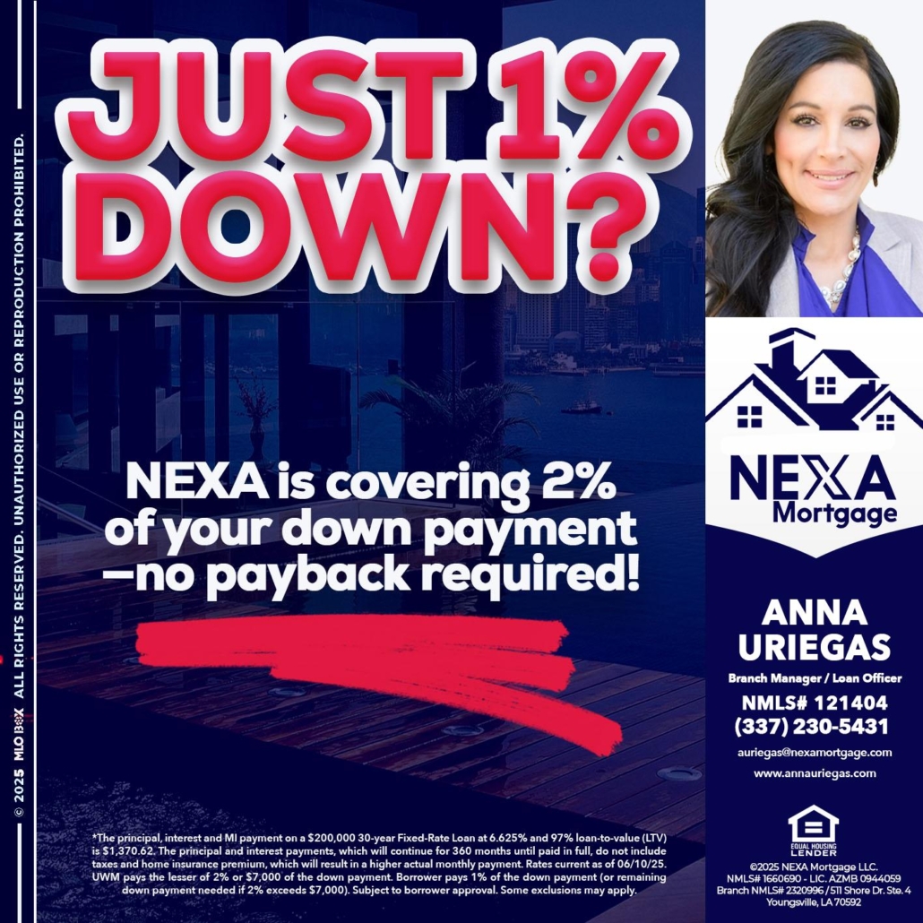 Hi, my name is Anna Uriegas. I’m a Loan Officer with NEXA Mortgage LLC., offering personalized mortgage solutions, fast customized quotes, great rates and service with integrity.