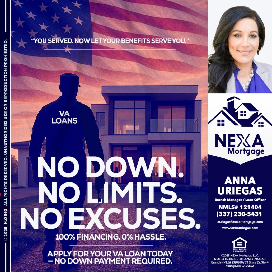 NO DOWN. NO LIMIT. - Anna Uriegas -Loan OfficerHi, my name is Anna Uriegas. I’m a Loan Officer with NEXA Mortgage LLC., offering personalized mortgage solutions, fast customized quotes, great rates and service with integrity.