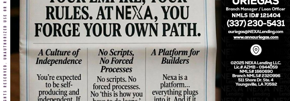 THE NEXA BUILDER - Anna Uriegas -Loan OfficerHi, my name is Anna Uriegas. I’m a Loan Officer with NEXA Lending LLC., offering personalized mortgage solutions, fast customized quotes, great rates and service with integrity.