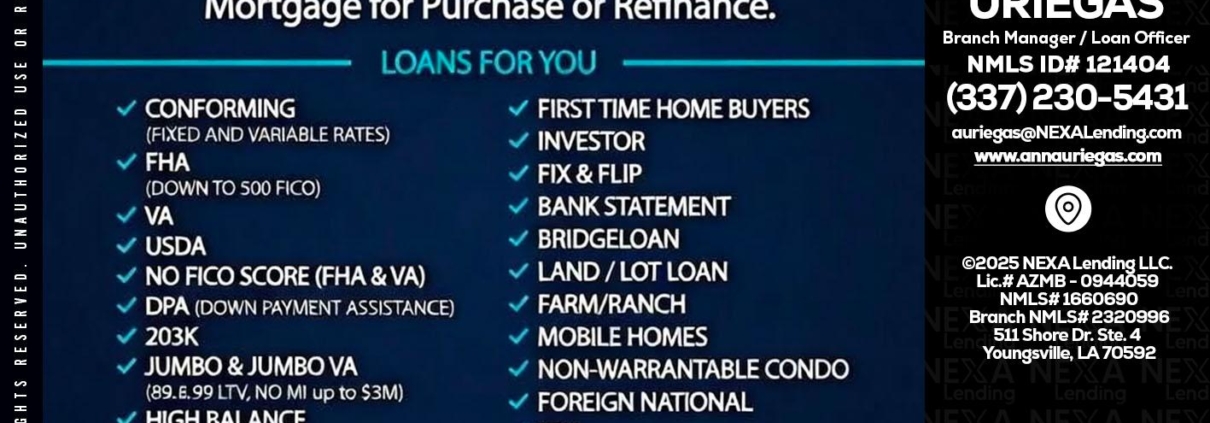 Hi, my name is Anna Uriegas. I’m a Loan Officer with NEXA Lending LLC., offering personalized mortgage solutions, fast customized quotes, great rates and service with integrity.