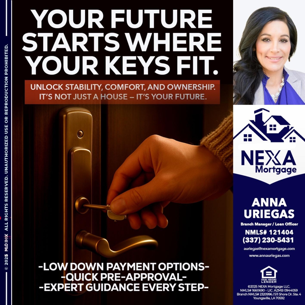 Hi, my name is Anna Uriegas. I’m a Loan Officer with NEXA Mortgage LLC., offering personalized mortgage solutions, fast customized quotes, great rates and service with integrity.